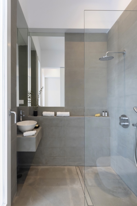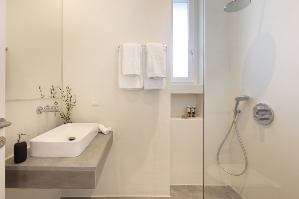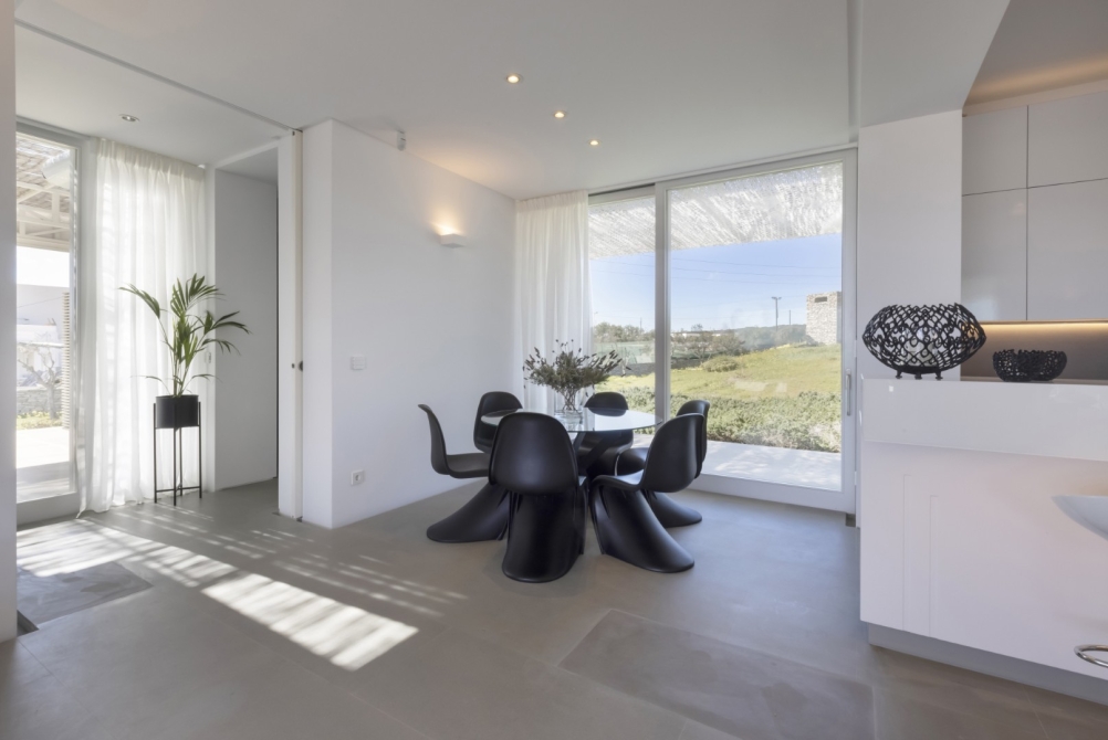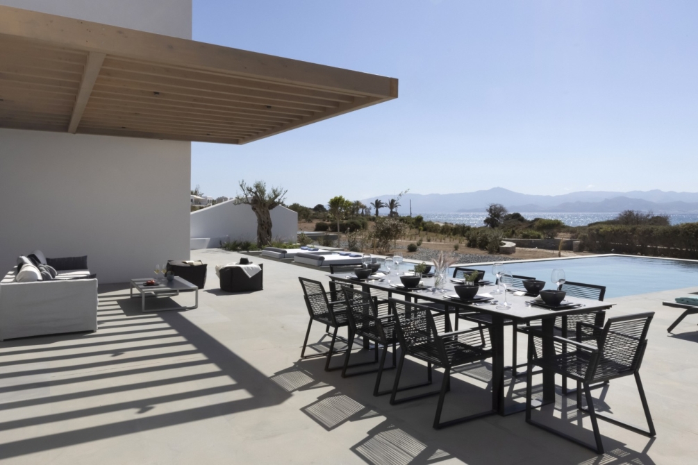 Outdoors, Villa Aeolia II invites you to embrace the Cycladic lifestyle with a beautiful infinity swimming pool surrounded by comfortable pool sunbeds, a stylish outdoor dining and living area, and a refreshing outdoor shower stall. A central garage door and pedestrian doorway lead directly to the beach, while a private open-space garage provides secure and convenient parking.