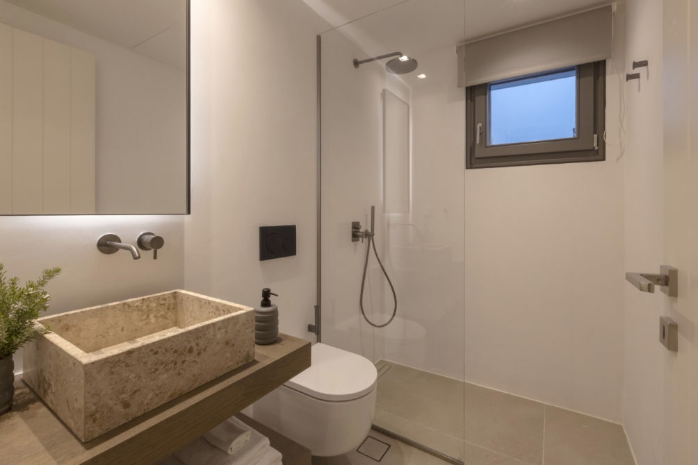 Spanning 350 square meters, the villa accommodates up to ten guests and features five en-suite double bedrooms, including a master en-suite bedroom on the first floor, two en-suite double bedrooms on the ground floor, and two en-suite double bedrooms on the basement level. Additional spaces include a service bedroom with its own bathroom in the basement, a guest WC on the ground floor, a playroom, and a fully equipped laundry room with washing machine, dryer, flat iron, and ironing board.