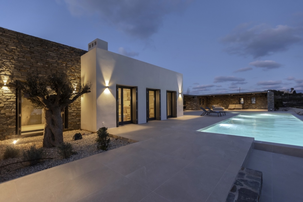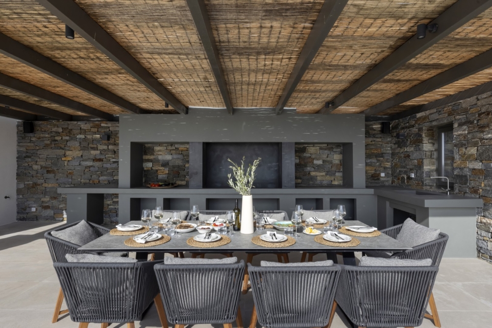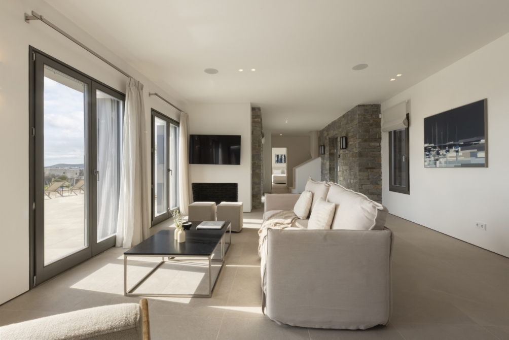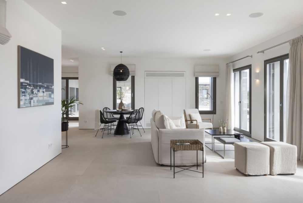 The outdoor areas include an infinity swimming pool with sunbeds, a BBQ area, and generous outdoor dining and lounge spaces. With direct pedestrian access to the beach, a central garage door, and private enclosed parking for up to three cars, Villa Resonance II offers an exceptional combination of privacy, luxury, and prime seaside living close to Naoussa.