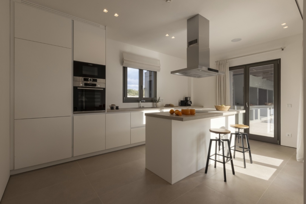 Covering 350 square meters, the villa accommodates up to ten guests and offers a well-balanced layout with a master en-suite bedroom on the first floor, two en-suite bedrooms on the ground floor, and two double bedrooms on the basement level sharing a bathroom. The villa also includes a service bedroom with bathroom in the basement, a guest WC on the ground floor, a playroom, and a fully equipped laundry room with washing machine, dryer, flat iron, and ironing board.